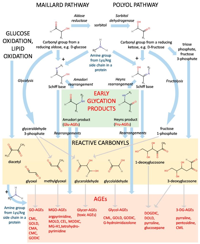 ที่น่ากลัวไปกว่านั้นคือ ในคนที่เป็นเบาหวานแล้ว น้ำตาลที่เยอะเกินจะถูกเปลี่ยนไปเป็นน้ำตาลฟรุกโตส ซึ่งตัวนี้ก็สามารถสร้าง AGEs ได้เหมือนกัน