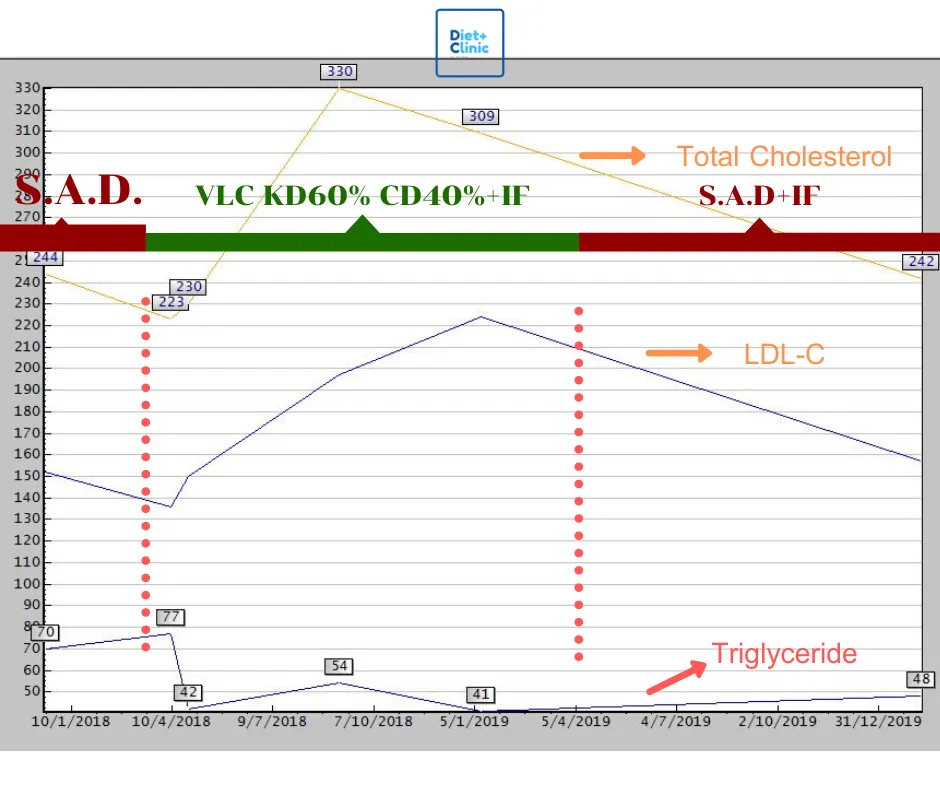หลังจากเดือนกรกฎาคม 2019 ผมทดลองกลับมาทานคาร์บใหม่ S.A.D เหมือนเดิม แต่ IF อย่างน้อย 16 ชม ทุกวัน จะเห็นว่า LDL และคอเลสเตอรอลก็ยังคงลดลงอย่างต่อเนื่องเพราะผม Switch ให้ร่างกายมาใช้คาร์บเป็นหลัก ร่างกายไม่มีความจำเป็นต้องใช้ Lipoprotien มา Circulate TG เยอะเท่าแต่ก่อนแล้ว อีกอย่างคือ หลังงานเยอะมาก ไม่ได้ไปออกกำลังกายเท่าไหร่ด้วย