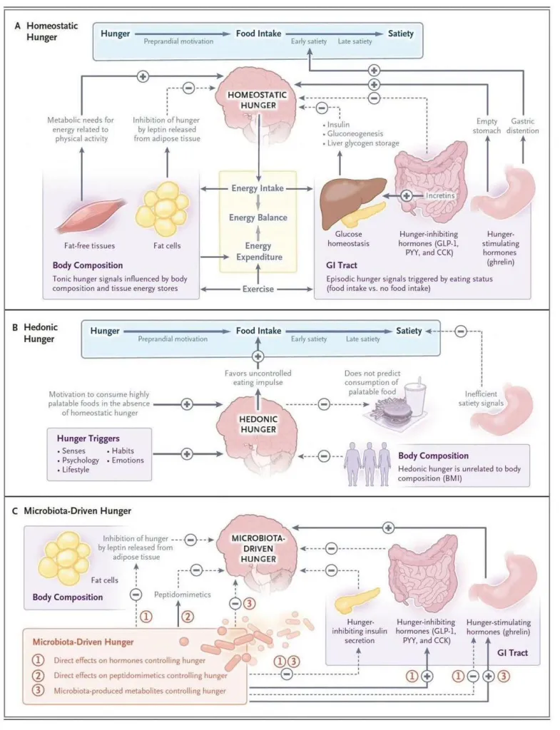 | Microbiota-Driven | จุลินทรีย์ในลำไส้ | แบคทีเรียและสารเมแทบอไลต์ | หิวเพราะลำไส้ไม่สมดุล |