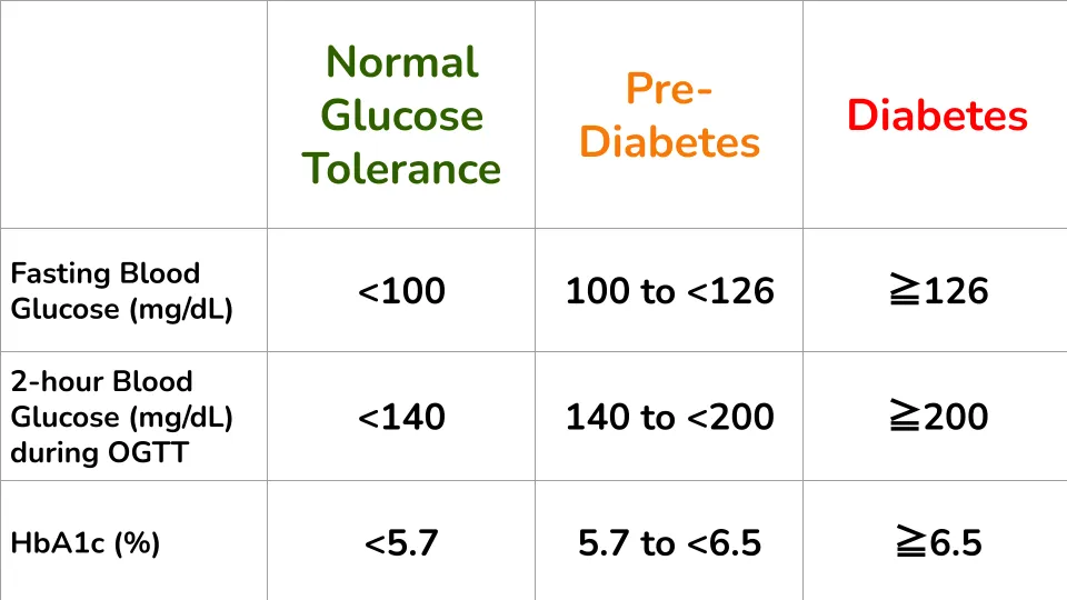 | น้ำตาล 2 ชั่วโมงหลังเริ่มกิน | ≥140 mg/dL (อาจมีภาวะ Glucose Intolerance) |