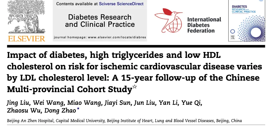 การศึกษานี้มีวัตถุประสงค์เพื่อตรวจสอบผลกระทบของโรคเบาหวาน ไตรกลีเซอไรด์สูงและ HDL-C ที่ต่ำต่อความเสี่ยงต่อโรคหลอดเลือดหัวใจตีบ และเพื่อสำรวจความสัมพันธ์ระหว่างระดับคอเลสเตอรอล LDL และความเสี่ยง ICVD ในกลุ่มประชากรหลายมณฑลของจีน