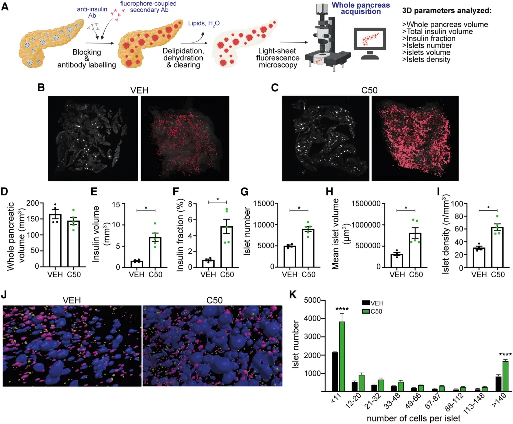 การวิเคราะห์ภาพสามมิติยืนยันว่าตับอ่อนของหนูที่ดื้ออินซูลินมีกลุ่มเซลล์เบต้าทั้งจำนวนและขนาดเพิ่มขึ้น ทำให้ผลิตอินซูลินได้มากขึ้นเพื่อชดเชยภาวะดื้ออินซูลิน